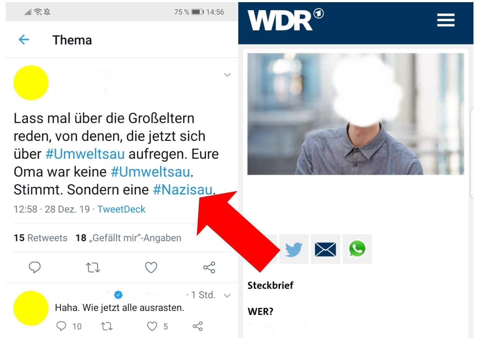 Das war jedoch nicht der Gipfel des Eisbergs. Hinzu kam, dass ein freier Mitarbeiter des WDR die älteren Herrschaften nicht nur als „Umweltsau“, sondern ebenso noch als „Nazisau“ beschimpfte!