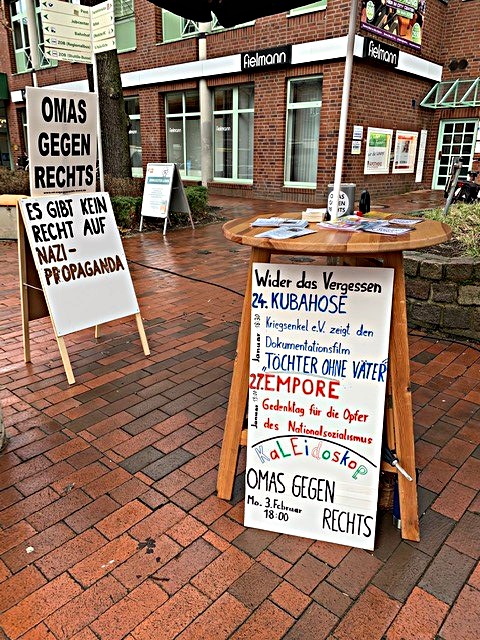 Am 22.01.2020 gab es von „Omas gegen Rechts“ einen Infostand auf dem Buchholzer Wochenmarkt. Der Begriff „Info“ war sicherlich falsch gewählt, denn Informationen gab es so gut wie keine.