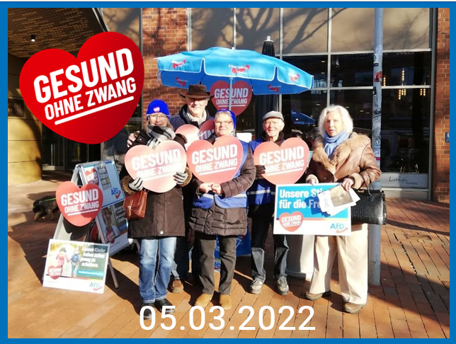Landkreis Harburg Am 05. März 2022 fand die bundesweite Aktion der AfD „Gesund ohne Zwang“ statt. Gemeinsam haben wir in vielen Städten im Land ein Zeichen gegen Impfzwang, Diffamierung und Spaltung und für die Freiheit, für ein solidarisches Miteinander, für unsere Kinder und für Normalität gesetzt. Gemeinsam waren auch der SV Buchholz sowie unser Ortsverband